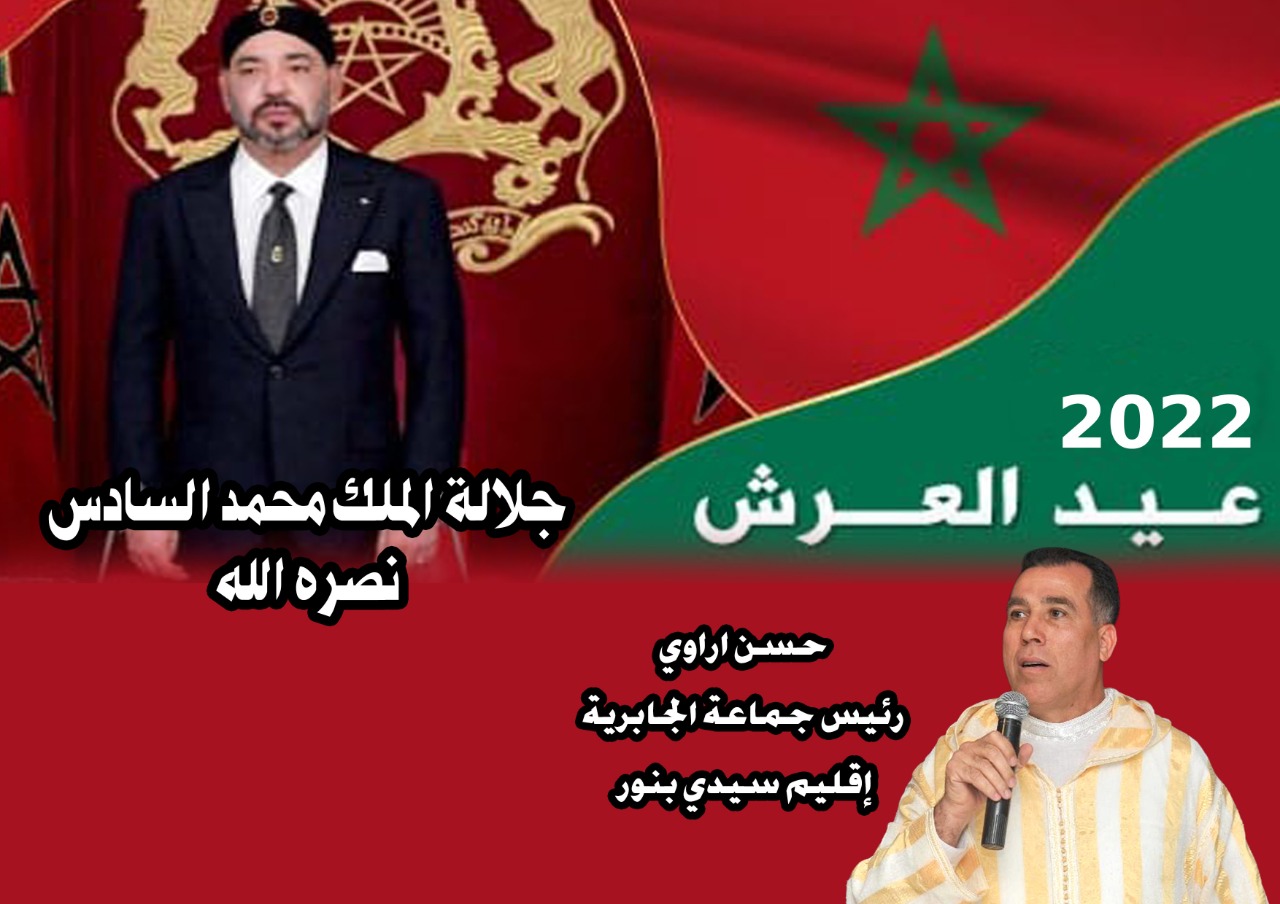 بمناسبة حلول ذكرى عيد العرش المجيد يتشرف خديم الأعتاب الشريفة “حسن اراوي” رئيس جماعة الجابرية إقليم سيدي بنور أصالة عن نفسه ونيابة عن كافة أعضاء وأطر وموظفي الجماعة بتقديم أسمى عبارات التهاني وأغلى الأماني إلى مقام : صاحب الجلالة الملك محمد السادس نصره الله سائلا الله عز وجل أن يحفظ جلالته بما حفظ به الذكر الحكيم ويسدد خطاه ويقر عينه بصاحب السمو الملكي ولي العهد الأمير مولاي الحسن ويشد ازره بصنوه السعيد صاحب السمو الملكي الأمير مولاي رشيد وبكافة أفراد الأسرة الملكية الشريفة إنه سميع مجيب.