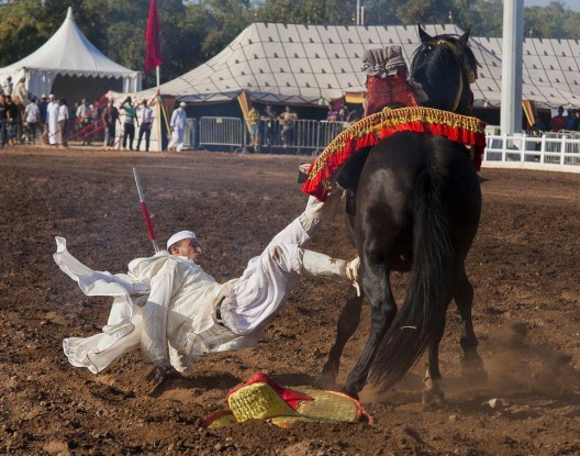 أصيب عشية اليوم الجمعة طفل بجروح بليغة على مستوى وجهه إثر تلقيه ركلة قوية من حصان مدجج بحلبة التبوريدة لموسم مولاي عبد الله أمغار . حادث استنفر عناصر الدرك املكي ولجنة التنظيم والوقاية المدنية حيث جرى نقل الطفل المصاب لتلقي العلاجات الضرورية فيما باشر رجال الدرك الملكي البحث والتحقيق في أسباب الواقعة . هذا وقد شهدت الحلبة الرئيسية للتبوريدة في أول أيام موسم الوالي الصالح مولاي عبد الله أمغار تجمعا استعراضيا لعدة علفات قدمت من مختلف مناطق المغرب للمشاركة في فنون التبوريدة . كان الافتتاح الرسمي للموسم زوال اليوم الجمعية 5 غشت الجاري بأداء صلاة الجمعة وسيستمر إلى غاية 12 من الشهر .